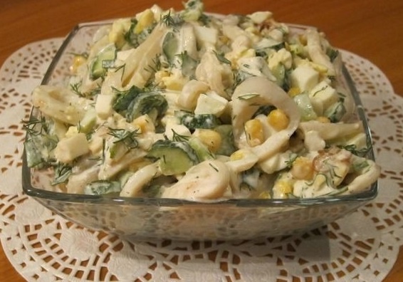 Ингредиенты: Приготовление: Пикантный, но в то же время нежный салат придётся по вкусу и вам, и вашим близким. Готовится просто и быстро.
