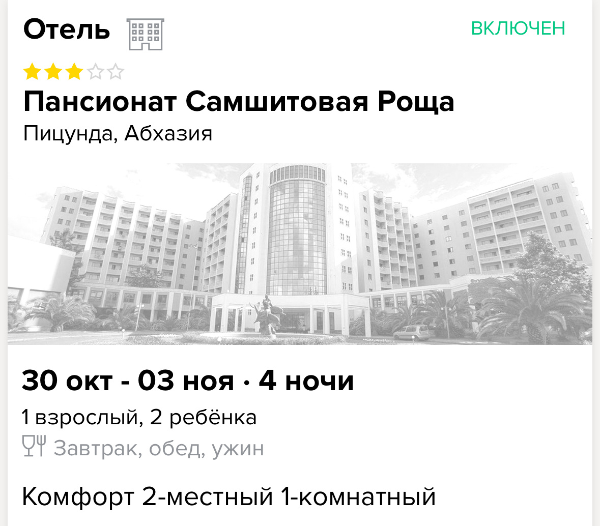 Итак, отдыхали мы в санатории «Самшитовая роща» (рядом с Пицундой). Как и в прошлый раз, я покупала тур с перелетом в сервисе левелтревел.