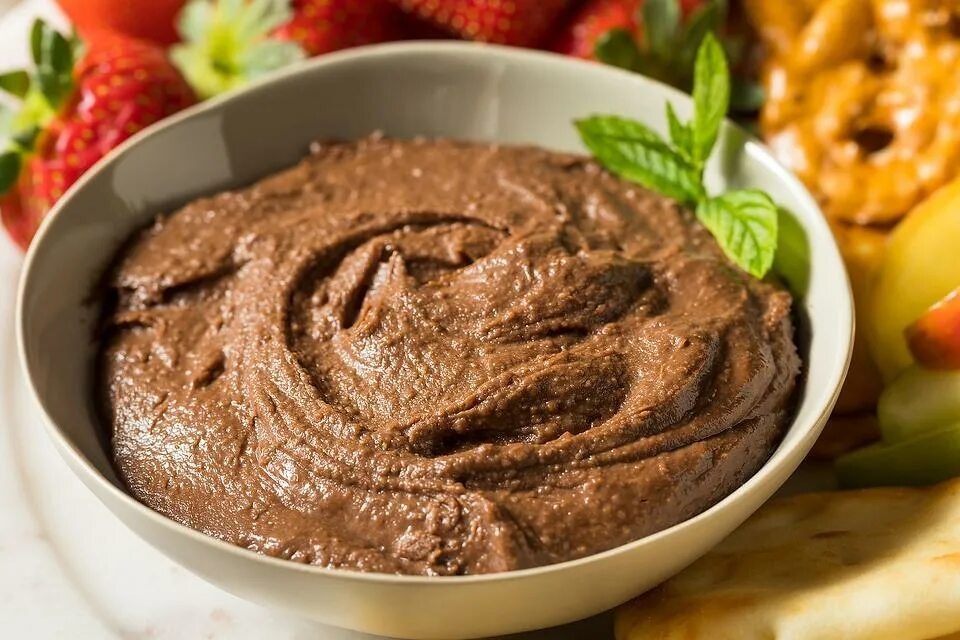 Вот рецепт шоколадного хумуса — здорового и вкусного десерта, который можно подавать с фруктами, печеньем или намазывать на тосты. - 1 банка (400 г) консервированного нута (или 1.5 стакана вареного нута) - 3-4 ст. ложки тахини (кунжутной пасты) (по желанию) - 2-4 ст. ложки меда или кленового сиропа (по вкусу) - 2-3 ст. ложки какао-порошка (по вкусу) - 1 ч. ложка ванильного экстракта - Щепотка соли - 2-3 ст. ложки воды (по необходимости для консистенции) Если вы используете консервированный нут, хорошо промойте его под холодной водой и слейте. Если нут вареный, убедитесь, что он мягкий. В блендер или кухонный комбайн поместите нут, тахини (если используете), мед или кленовый сироп, какао-порошок, ванильный экстракт и щепотку соли. Измельчайте ингредиенты на высокой скорости до однородной массы. Если смесь слишком густая, добавляйте по одной столовой ложке воды до достижения желаемой консистенции. Попробуйте хумус и при необходимости добавьте больше меда, какао или соли по вкусу.