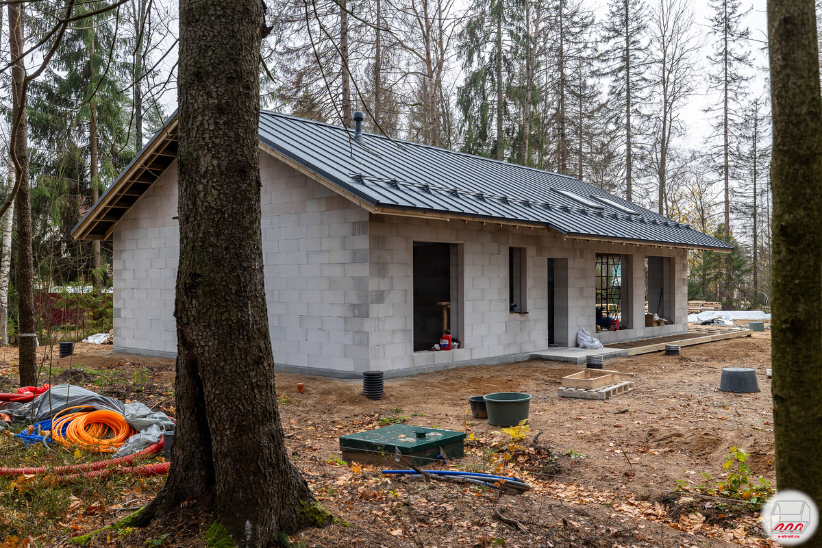Заканчивается II этап стройки на нашем текущем объекте в Зеленогорске, где мы строим типовой одноэтажный дом 9.2*15.6 На крыше кликфальц Pro от Grand Line. Металл 0,5 мм, покрытие Satin Matt, цвет RAL 7024 (мокрый асфальт). Два мансардных окна Fakro FTP-V U4 94*140 см над зоной гостиной, потолок там будет утепляться и подшиваться по стропилам. Расположение мансардных окон получилось в не вполне симметричным. Обычно стараемся поместить проёмы по центру картины, ну или картины по центру проёма, а тут получилось не совсем так: Как обычно, почти никто кроме птиц этого не увидит, но жаль, что так вышло. Особенно в типовом проекте. "Коробка под крышу" выглядит почти готовой, однако внутри ещё не доделаны перегородки. Остаётся закончить все внутренние стены, навести порядок и можно будет сдавать объект.