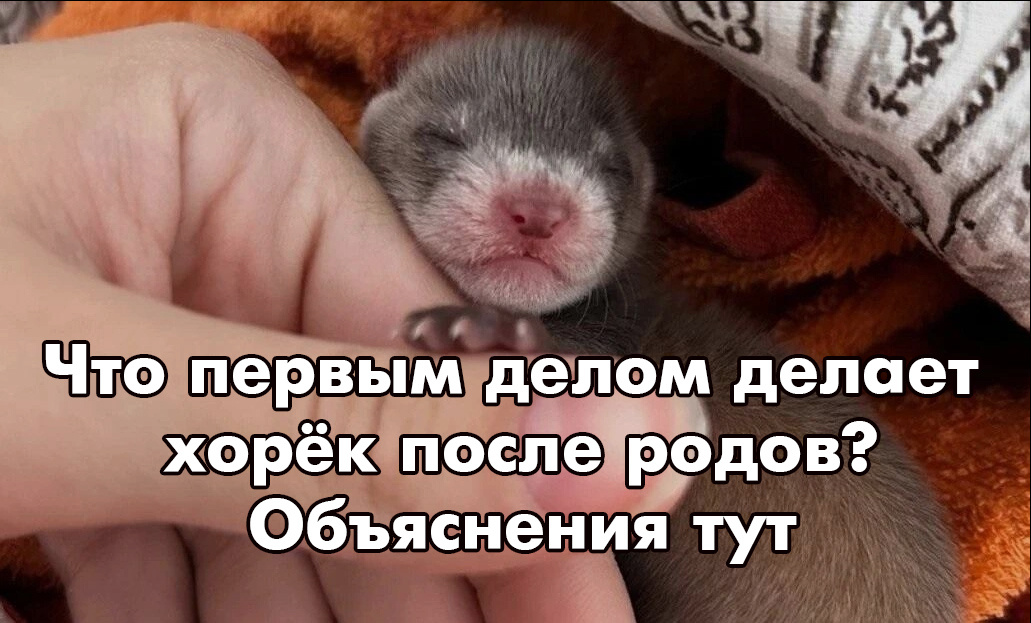 Оказывается, первое, что делает хорёк после родов, показывает своих малышей хозяину. Это связано с тем, что только после того, как к малышам прикоснётся хозяин, они будут нести на себе его запах. Детёныши хорька, не получившие одобрение хозяина, рискуют быть отвергнутыми, поэтому мать с нетерпением ждёт момента знакомства хозяина с новорождёнными.