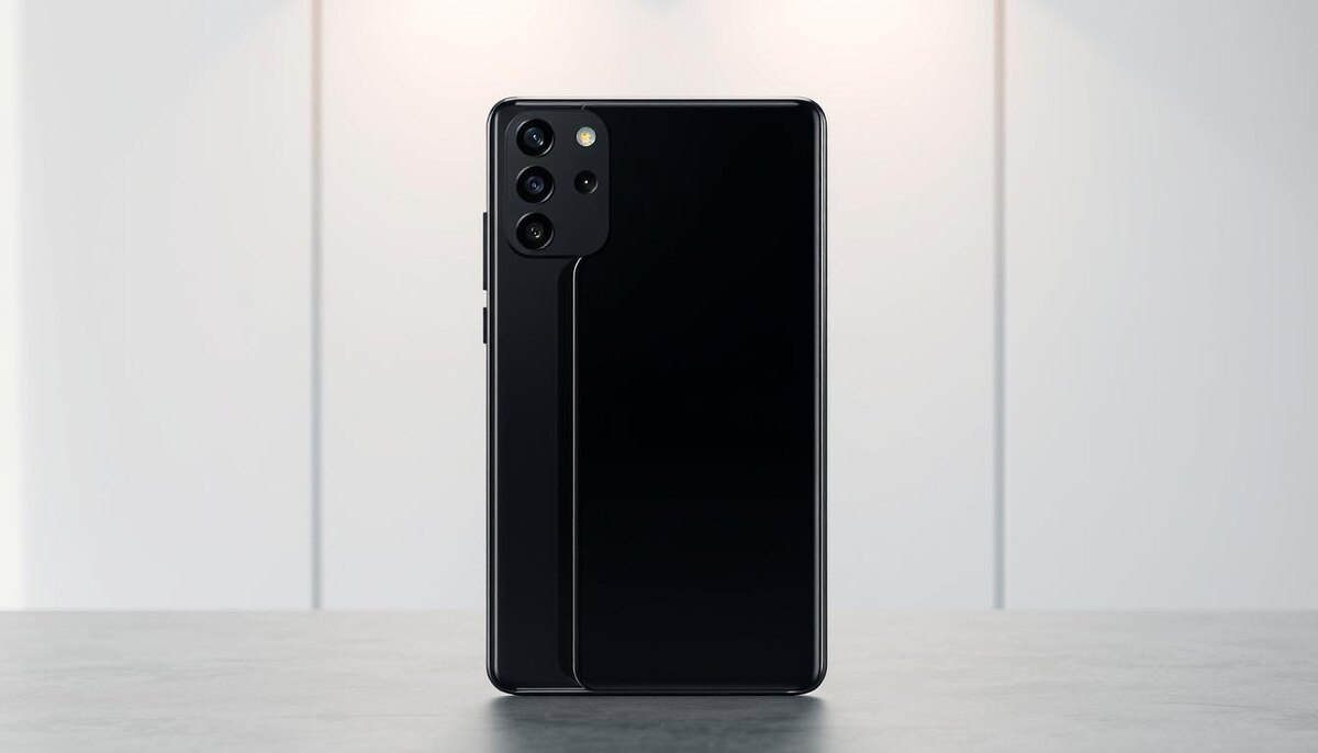 Элегантный, современный дизайн смартфона Samsung Galaxy S24 Ultra в цвете «титановый черный» демонстрирует его элегантные изгибы, яркий дисплей и полированную отделку с акцентом на массив задней камеры и высококачественные материалы на минималистичном фоне, который подчеркивает его роскошную привлекательность.