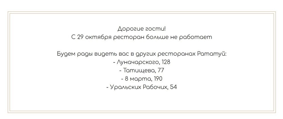 С 29 октября ресторан «Рататуй» на Малышева, 25 в Екатеринбурге больше не работает. Информация об этом появилась на сайте заведения. Представители сети сообщили, что заведение больше не откроется: Ресторан на Малышева закрывается навсегда. Это был один из самых старых ресторанов, так что пришло время. Новые заведения «Рататуй», которые открылись за последние три года, — большие, красивые, светлые, там совсем другая атмосфера и хочется, чтобы с такими ресторанами ассоциировалась сеть (цитата по E1.RU). Напомним, что первый ресторан «Рататуй» открылся в Екатеринбурге в 2010 г. на Уралмаше. Ресторан на Малышева работал с 2014 г. Возможно, его закрытие связано с постепенным изменением концепции сети. Изначально «Рататуй» — это кафе для друзей и молодежи, это было отражено и в нашем первом логотипе. Пока мы открывали рестораны — росли, взрослели, обзаводились семьями — у нас появились дети. В итоге вместе с профессиональным опытом мы получили еще и жизненный, и за десять лет у нас выкристал