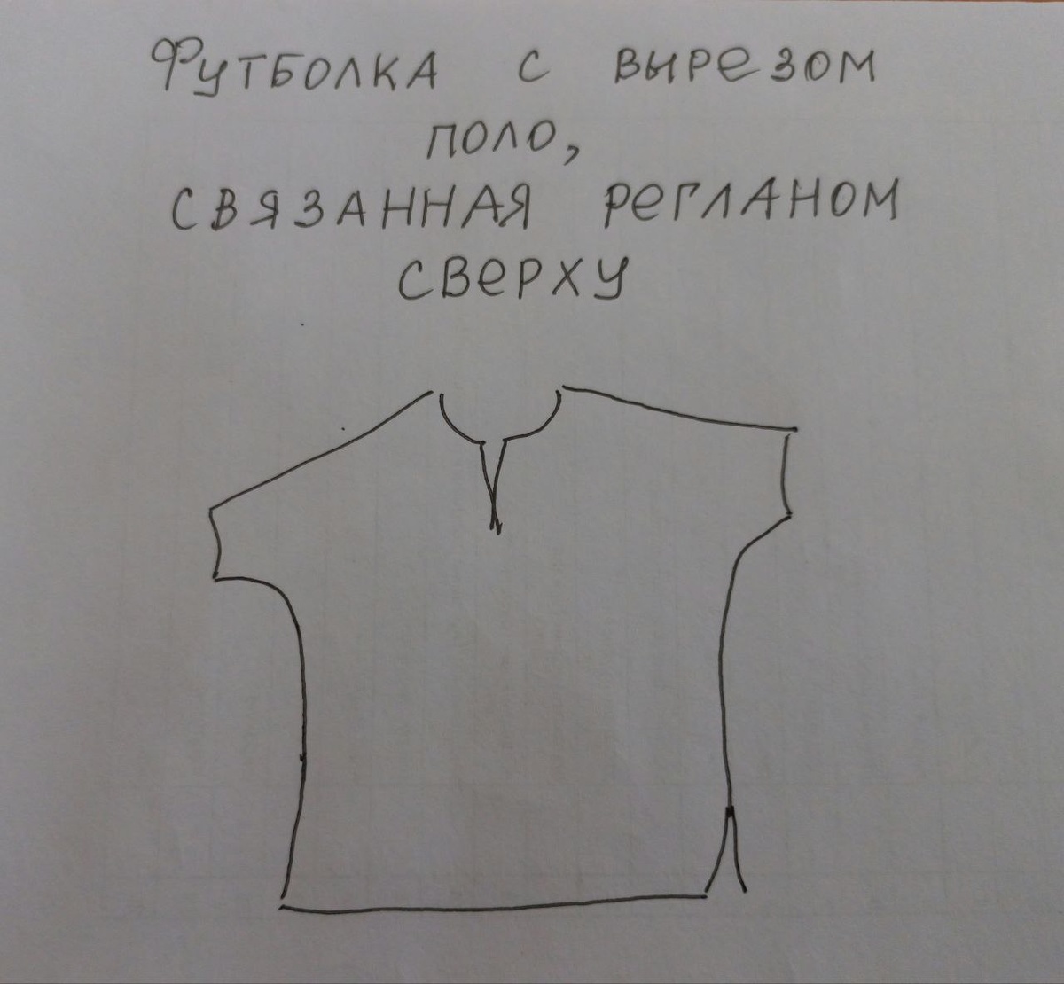 Что буду вязать? Планирую создать летнюю футболку крючком с вырезом поло. Хочу широкую кофточку, без швов, без застёжки. Какой будет воротник и будет ли он, ещё не решила. Схематично изобразила: