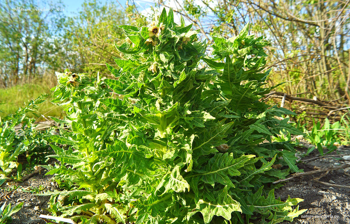 Двулетнее травянистое растение из семейства паслёновые (Solanaceae). В Республике Мордовия встречается повсеместно, во всех районах. Является рудеральным сорняком, так как растет в заброшенных местах, около дорог и жилья, по залежам и в поселках. Цветёт в июне — июле. Все части растения ядовитые. В народе ее называют дурь-травой. Это растение высотой, в пределах 20 — 115 см с темно-зелеными листьями, которые покрыты мягкими клейкими волосками с неприятным запахом. Проще всего узнать белену в период цветения: у нее крупные (до 4 сантиметра в диаметре) бледные цветы, которые собраны на верхушке стебля, с розовыми прожилками, по форме напоминающие колокольчик с пятью острыми лепестками. Всходит в марте – мае. Двухлетник: цветет в первый год жизни в июне – июле, на следующий год – в мае – июне. Плодоносит в июле – августе. Теперь поговорим про ядовитость белены. Всем известно такое выражение «белены объелся», что означает - «вести себя так, как будто сошёл с ума». Дело в том, что все виды