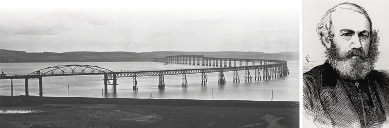 Слева: Мост Тэй до крушения. Фото: University of St Andrews Libraries and Museums, collections.st-andrews.ac.uk. Справа: Томас Бауч. Иллюстрация: Illustrated London News, de.wikipedia.org