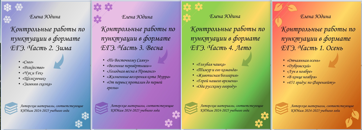 Прошло совсем немного времени с тех пор, как я закончила работу над сборником "Времена года" с заданиями по пунктуации и обновила в соответствии с новой демоверсией свои пособия с вариантами ЕГЭ, а в голове уже забродили мысли по поводу новых заданий, которыми можно поделиться с читателями. Собственно говоря, мысли эти расползались по трём направлениям: в сторону 16-го задания, в сторону 21-го задания и в сторону заданий по орфографии. Я сгребла их в кучу и решила пока сконцентрироваться на заданиях 9-15: придумать 20 вариантов по орфографии в дополнение к имеющимся 20 по пунктуации во "Временах года": Села творить, и тут Остапа, как говорится, понесло. А что если и задания по орфографии связать с временами года? - Лена! - сразу же закричал здравомыслящий человек внутри меня. - Остановись! Представляешь, сколько времени это у тебя займёт? - Я только попробую, - уговаривал его робкий, но креативный внутренний творец. - Если не пойдёт, сделаем обычные варианты из серии "быстренько, но пр