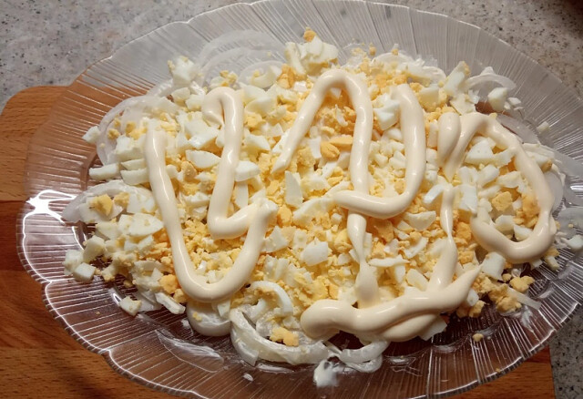 Далее первый слой лук, сливаем с него всю жидкость, равномерно раскладываем, сверху слой майонеза.
