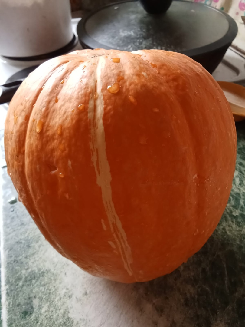Тыква; Фарш, любое рубленое мясо или набор для солянки; Картофель 3-5 штук; Лук 1 шт; Перец болгарский 1 шт; Специи по вкусу, соль, паприка; Масло сливочное 50 грамм; Фольга. Моем тыкву Срезаем шляпу с тыквы Вынимаем все тыквенные семечки. Если хорошие, сушим, щелкаем. Они полезные. Чистим, моем картошку Мелко кубиками режем картофель, желательно даже натереть на терке, чтобы хорошо проварился в тыкве. Рубленое мясо или фарш смешиваем с картошкой. У меня набор для солянки. Добавляем рубленый лук и болгарский перец Добавляем специи по вкусу, соль немного и паприку чайную ложку Перемешиваем нашу начинку Начиняем тыкву до верха полностью Сверху кладем 50-100 грамм сливочного масла Закрываем тыквенный колобок крышкой и тремя слоями заматываем плотно фальгой. Остатки начинки тоже завернула в фольгу, чтобы запечь в духовке. Запекаем тыкву в разогретой духовке 2 часа. При 180 градусов. Возможно и больше по времени, смотря какая начинка За минут 20, сверху убрать фольгу и запекать тыкву до ру