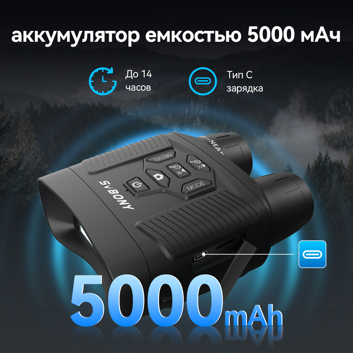 Инфракрасный бинокулярный прицел ночного видения SVBONY SA206 высокой интенсивности может похвастаться аккумулятором сверхвысокой емкости 5000 мАч со временем работы до 14 часов, что снижает беспокойство об истощении аккумулятора. Кроме того, он оснащен удобным портом зарядки Type-C, обеспечивающим легкую зарядку и длительное использование прибора ночного видения. Вы можете уверенно заниматься наблюдением или исследованием. В этой статье мы расскажем о длительной работе SA206. Сначала мы представим аккумулятор сверхвысокой емкости SA206. Длительное время работы: оснащен аккумулятором емкостью 5000 мАч Бинокль ночного видения SA206 оснащен аккумулятором высокой емкости 5000 мАч, обеспечивающим до 14 часов непрерывной работы. Это означает, что бинокулярный прибор ночного видения может работать без необходимости частой подзарядки, что снижает беспокойство о разрядке аккумулятора и прерывании использования оборудования. Он обеспечивает вам длительный опыт использования, позволяя вам уверен