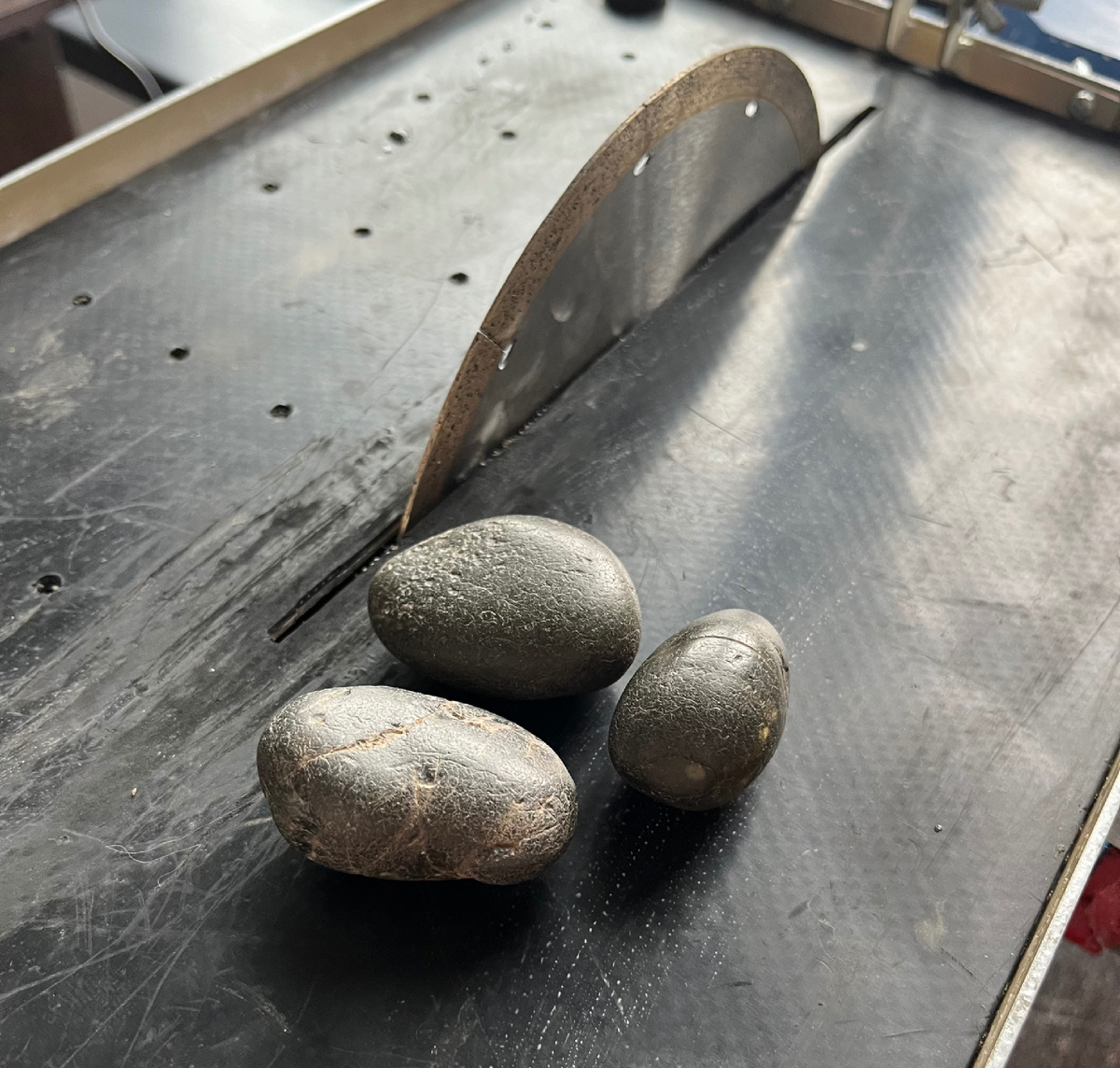Эти камни я привозила своему знакомому, который помогал мне протестировать новый станок. Они довольно крупные, и мне было страшновато браться за них, а посмотреть, что внутри, очень хотелось. Один из них лежал у меня лет пять! А еще, к сожалению, практически все крупные камни нашей реки имеют трещины по все поверхности. При распиле камень может просто развалится на несколько частей. Так и произошло с одним из этих камней.
