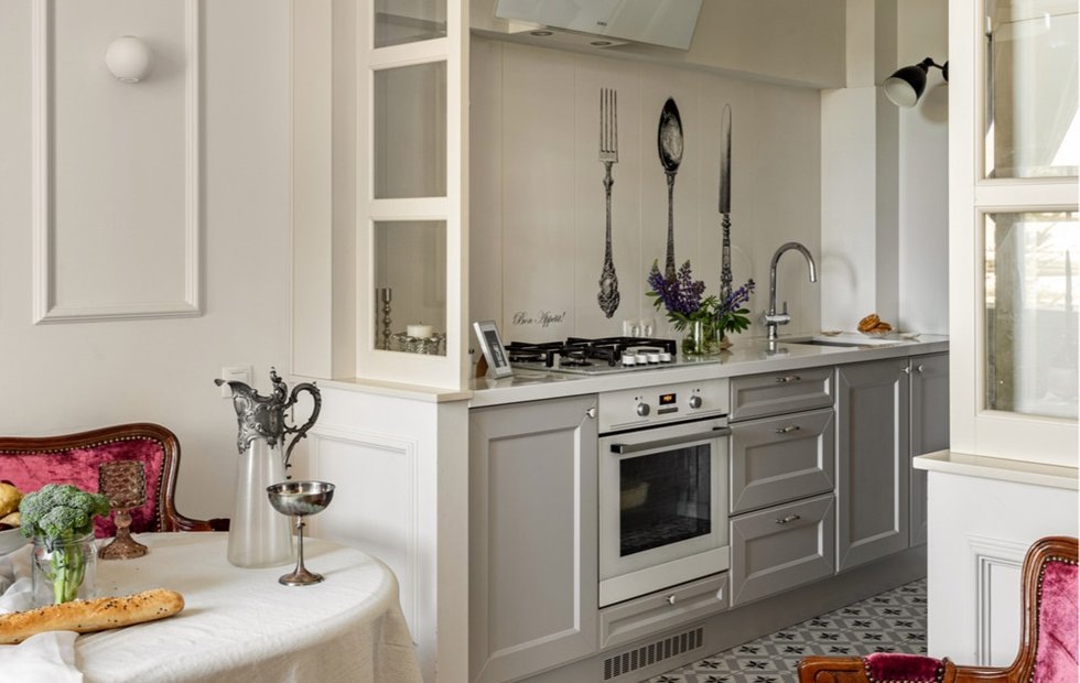 Чтобы воссоздать классическую стилистику, здесь использовали материалы, характерные для французских интерьеров: паркет «елочкой», краску на стенах, классические молдинги. Вся мебель и двери выполнены по индивидуальному заказу из высококачественных материалов.