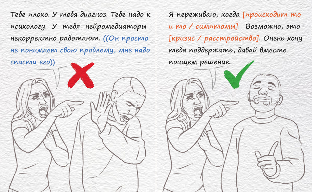 - Если человек не ходил к специалисту и открещивается, толкать не имеет смысла. Нельзя спасти того, кто не участвует в своем спасении. И тем более не стоит самостоятельно ставить диагнозы и убеждать человека в их наличии. Вы можете поделиться своими эмоциями и переживаниями (принять то, что они ваши, и это ваша ответственность – как справляться с ними) и поделиться желанием разобраться с этим вместе.