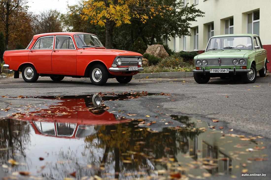 Ярко-красный «Москвич» и окрашенные в сочный зеленый цвет «Жигули» выделяются даже на фоне живописного осеннего пейзажа. Не верится, что 412-му — почти полтинник, а «тройке» более сорока лет, и при этом оба автомобиля не подвергались реставрации, это их оригинальное состояние. Даешь сравнительный ретротест?