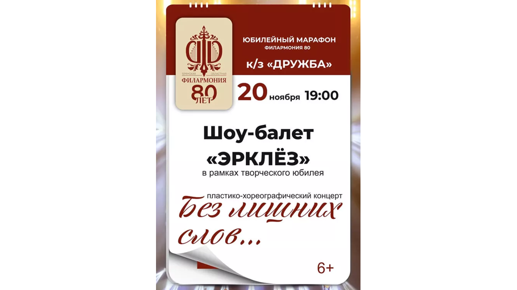 Брянская областная филармония приглашает на пластико-хореографический концерт «Без лишних слов...» в рамках творческого юбилея шоу-группы «Эрклёз» и юбилейного марафона «Филармония- 80». Шоу-балет "Эрклёз" —это всегда украшение сцены, они задают настроение и стиль. Мероприятие состоится в среду, 20 ноября. Начало в 19:00.