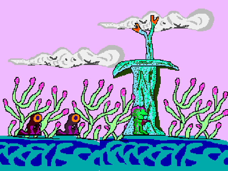 Пиксель арт на сегодня по мотивам видеоигры Cosmos Cosmic Adventure для компьютерной системы IBM PC MS DOS. Величайшее достижение 90ых – это ай би эм пк компьютер с операционной системой МС ДОС. И вершина - это 486 ДХ2 компьютер. Для системы МС ДОС – крутейшая система. Помню, как в те годы просто обожал эту игру. Такой яркий и добрый инопланетянин. Зеленый! Он зелёный! Смотри он зеленый! Братик тоже обожал эту игрушку! Вот мы играли в эту игру Космо Космик, как мы ее называли! Там кажется, есть уровень про осенний лес, кстати. В тему осени. А это мой рисунок на подобную тему. Тарелка НЛО приземлилась на пригодной для веселья планете. Тут все такое веселое. Растения умеют разговаривать. На небе яркое небо. И все такое разнообразное. Так, тут можно как следует повеселиться! – подумал тот, кто прилетел на летающем блюдце. На своей самой продвинутой тарелке НЛО, какую он только смог собрать! Планетка такая весёленькая. Что тут можно включить какую-нибудь веселую музычку! Чтобы было еще вес