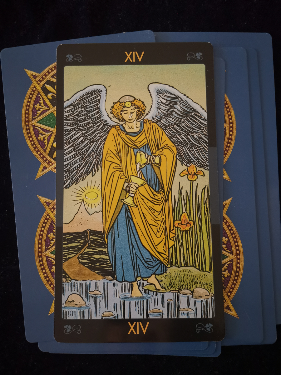 Нам необходима мудрость, спокойствие, умеренность, движение вперёд без потери себя. Остановитесь и найдите баланс. Умеренность - одна из главный христианских добродетелей вместе со стойкостью (Силой) и благоразумием (Отшельником) или (Повешенным). В качестве таковой "Умеренность" представляет покой и равновесие, гармоничное сочетание разнородных энергий, срединный путь. Ангел, в большинстве версий карты, стоит одной ногой на земле, а второй - на водах, предполагая тем самым слиянии внутренней жизни и действия. Умеренность позволяет нам заниматься делами, не утрачивая внутреннего ощущения равновесия. Действие без эго. Если хорошенько рассмотреть умеренность в Марсельском Таро, в колодах Райдера и Висконти, мы наверняка заметим угол, под которым ангел льёт воду. Проще говоря, так не бывает. Воду можно вылить под любым углом, но падать она всё равно будет вертикально вниз. Иными словами, карта показывает нам персонажа, который изящно и невозмутимо делает невозможное. "Умеренность" показыв