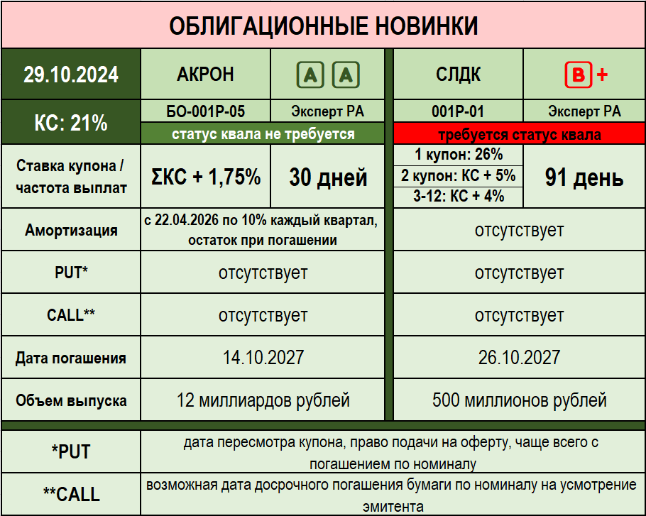 🕰 Здравствуйте, дорогие читатели! В эфире новинки - и, кажется, у нас с вами последнее начало торгов в этом месяце. Да, собственно, не очень то и надо :) ✅ Герои, пожелавшие увековечить себя в октябре 2024 года: 1️⃣ АКРОН БО-001Р-05 (🅰️🅰️) 🔢 ISIN: $RU000A109XR1 🔸 Купон плавающий: ΣКС + 1,75% 🔸 Значение рассчитывается ежедневно 🔸Без оферт и досрочного погашения 🔸 Погашение через 3 года 🔸 Последний рейтинговый отчет: https://raexpert.ru/releases/2023/dec12 Достаточно известному производителю удобрений, представленному двумя основными предприятиями в Великом Новгороде и Смоленской области, пришлось нелегко. Настолько, что в ходе сбора объем выпуска заявили лишь в самый последний момент, а ориентир премии купонной ставки и вовсе пришлось поднимать с 1,5% до 1,75%. Правда и это значение нельзя назвать идеально рыночным, но вот сэкономить на текущем рынке не получится точно. Инвесторов компания не любит - последняя презентация на сайте от февраля 2022 года, поэтому обойдусь кра