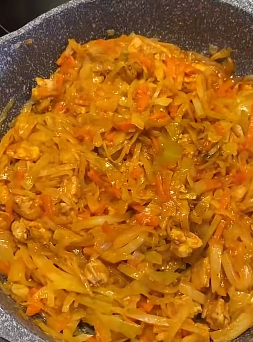 Сегодня расскажу, как я тушу капусту с куриным филе. Получается очень сочное и вкусное блюдо. Блюдо получается не жирное и подходит тем, кто соблюдает диету стол N5! Для приготовления нам понадобиться: В разогретую сковороду наливаем растительное масло, туда кладем нарезанное кубиками куриное филе, немного обжариваем 3-5 минут. К филе добавляем репчатый лук и тушим еще 2-3 минуты. Помидорку нарезаем тоже кубиками и добавляем, сверху солим, перчим и обязательно добавить конченную паприку, тогда блюдо получается очень вкусным! В это время шинкуем капусту, засыпаем сверху и закрываем крышкой. Тушим 5 минут и не забываем помешивать. В стакан наливаем 100 мл воды и добавляем 1 чайную ложку томатной пасты. Заливаем полученную смесь в капусту и тушим еще 10-15 минут. Перед готовностью за несколько минут я добавляю соль, пару минут и все готово. Приятного аппетита! Очень полезно и быстро!