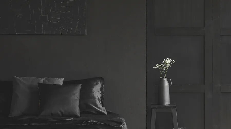 Приглушенные матовые оттенки черного идеально подходят для спальни, где важен не яркий дневной свет, а умиротворяющий полумрак. В интерьере спальни могут быть черные стены с фактурной поверхностью, черный ковролин, мягкая мебель темных оттенков или черный текстиль — шторы, покрывала и ковры.