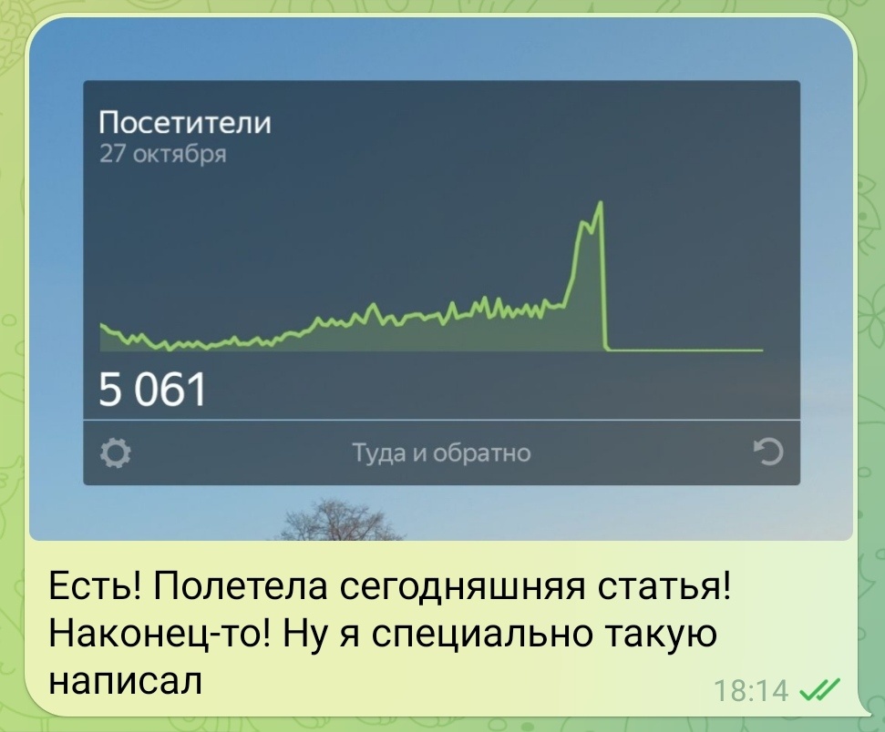 Написал я тут в воскресенье статью, друзья. Ну как «статью»… Так, подборку смешных историй и курьёзных случаев, обличённых в форму переписки в мессенджере. Как мне кажется, получилось довольно забавно. Такой формат я решил использовать, вдохновившись примером другого автора Дзена. Он никакого отношения к путешествиям не имеет, так что я ему не конкурент и обвинять меня в каком-то плагиате бессмысленно — я использовал только формат, все истории в статье — мои. У этого автора подобные подборки смешных переписок собирают десятки и сотни тысяч дочиток — я тоже так захотел. Потому что, как бы это сказать, Дзен показами в последнее время не радует, а этот формат проверенный и успешный. Статью выложил утром в воскресенье — если идея не сработает, то и не страшно, в выходные всё равно читают мало, так что у привычных статей по теме канала этот эксперимент показы не отберёт (ещё бы они были, эти показы, ха!) И что вы думаете? К середине дня в воскресенье статья взлетела! Ну, точнее, немного под