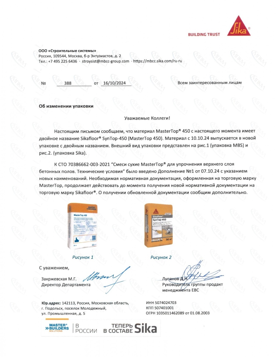 С 10.10.2024 г. материал MasterTop 450 выпускается в новой упаковке под двойным названием Sikafloor SynTop 450. Подробнее в письме: