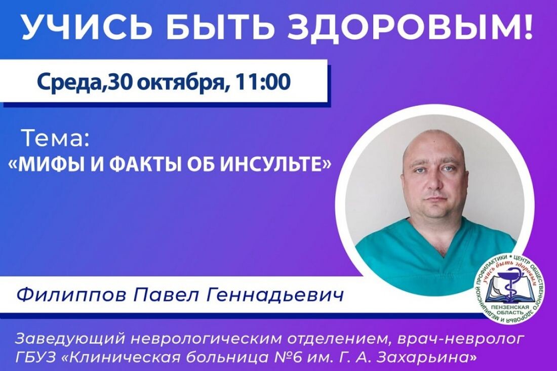 В среду, 30 октября, в рамках онлайн-проекта «Учись быть здоровым!» состоится прямой эфир на тему: «Мифы и факты об инсульте». Начало трансляции запланировано на 11:00, сообщается в телеграм-канале Пензенского центра общественного здоровья и медицинской профилактики.