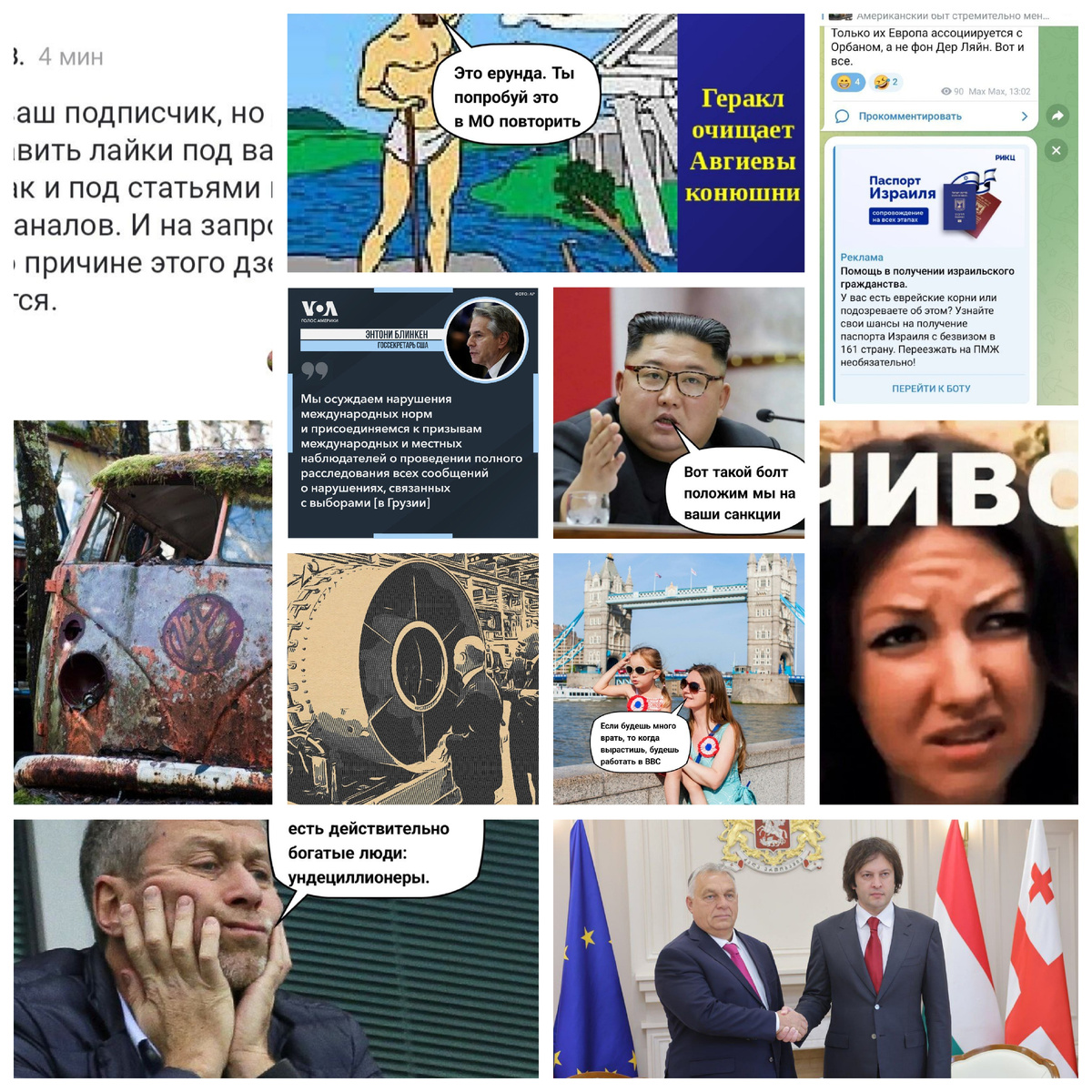 Ну, не Грузией единой. Предлагаю вашему вниманию свою небольшую подборку новостей. Остальное здесь: Сами понимаете, цензура... Поехали... Серый бан в дзене - это когда даже у подписчиков нет возможности поставить лайк. А если нет лайков, то нет и просмотров и рекомендаций другим пользователям. Арестован экс-глава какого-то управления чего-то там связи и управления генерал-лейтенант N-ский. Опять коррупция и опять откаты. Белоусов - чистильщик. Белоусов - Геракл. Вопрос из зала: - А зачем российскому патриотичному блогеру такую рекламу подсовывают? Через неделю вы покажете миру образцово-показательные выборы, да? Или явите миру новые международные нормы избирательной системы? Почувствовали себя богами. "Если ООН ослаблена, то другие государства, имеющие обоснованные опасения, должны обеспечить соблюдение этих санкций против стран-изгоев". 11 стран мира, в том числе США, Германия, Южная Корея и Япония создали некий международный орган, который будет будет поддерживать санкционный режим