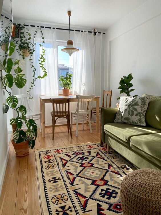 Многое на этой фотографии сделано вручную или отреставрировано, но мы постарались найти максимально похожие вещи! Диванчик на фото цвета Lamb Olive, но сейчас в наличии есть только более темный Jungle Турецкий хлопковый ковер Круглый пуф из джута Мы уверены, у многих где-нибудь на даче есть похожие советские деревянные стульчики от фабрики «Лигна»! Найти их можно, конечно, на Авито, там много разных вариантов. А также нашли похожий на Яндекс Маркете. Люстра – это ручная работа, переделка из вот такой старой советской в «новую», поэтому точь-в-точь такую не найти, но мы как всегда предлагаем вам похожие варианты на Вайлдберрис Стол тоже сделан вручную хозяевами квартиры, но на Яндекс Маркете есть почти такой же! Подушка с зеленью на Яндекс Маркете и Озон