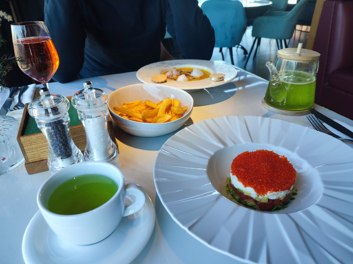 Еда оказалась на удивление классной. Артем ел тыквенный суп-пюре с креветками, а я салат из авокадо с камчатским крабом. Салат был просто восхитительный: идеальное сочетание мяса краба, мяса какой-то рыбы, овощей (авокадо, капуста), все это сбрызнуто соком лайма, что придает блюду свежести и легкости. И вдобавок хрустящая на зубах икра летучей рыбы.