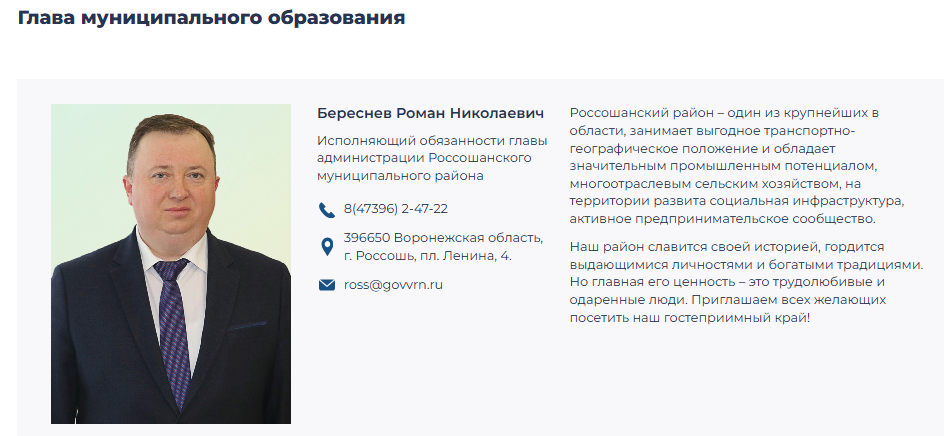 Роман Береснев возглавил администрацию Россошанского района Воронежской области. Пока он будет работать с приставкой и.о. Соответствующую информацию отобразили на сайте муниципалитета. До этого Береснев возглавлял Рамонский район, сообщение о том, что чиновник покидает свой пост, появилось 25 октября. Тогда же стало известно, что он уедет в Россошь по предложению губернатора Александра Гусева.