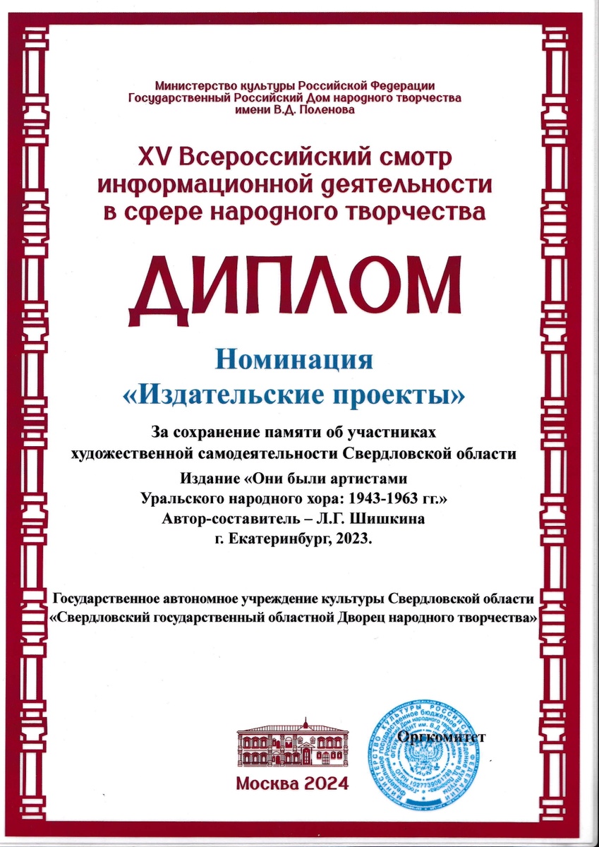Свердловский государственный областной Дворец народного творчества был награжден целым рядом дипломов по итогам XV Всероссийского смотра-конкурса информационной деятельности Д(Ц)НТ!