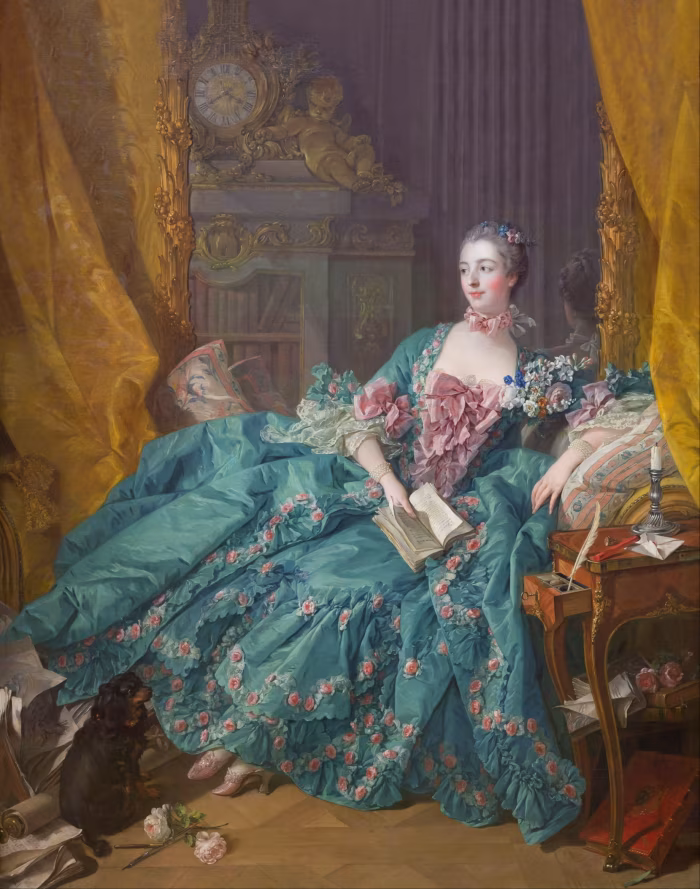 Мне нравится картина Франсуа Буше 1756 года «Мадам де Помпадур», которая находится в Старой пинакотеке в Мюнхене. Золотые занавеси раздвинуты, будто открывая Помпадур, любовницу французского короля Людовика XV, развалившуюся на своей кровати в центре сцены. Ее платье — почти самостоятельный персонаж картины, и, кажется, заполняет весь холст, но ее фигура никоим образом не умаляется. Позади нее — богато украшенный книжный шкаф с полками. Послушная собака сидит у ее ног рядом с разбросанными по полу цветами. На переднем плане картины расположен боковой столик с открытым ящиком, чернильницей и пером, а на полке под ним книги переваливают через край. Прямо в центре всей композиции находится раскрытая книга, которую Помпадур держит в руке.