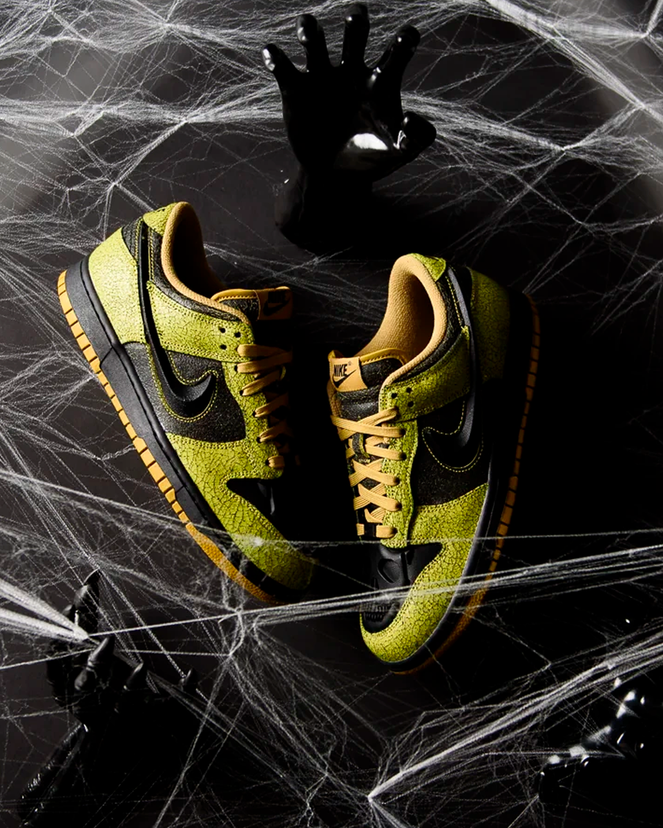 В этот раз Nike Dunk Low сочетает минимализм и зловещие детали: кожаные панели ядовито-зеленого оттенка с потрескавшимся эффектом, угольно-черная основа и рельефный череп на мысе, словно застывший в ночи призрак. Болотного цвета шнурки добавляют особый винтажный шарм, делая эту модель одновременно пугающей и стильной.