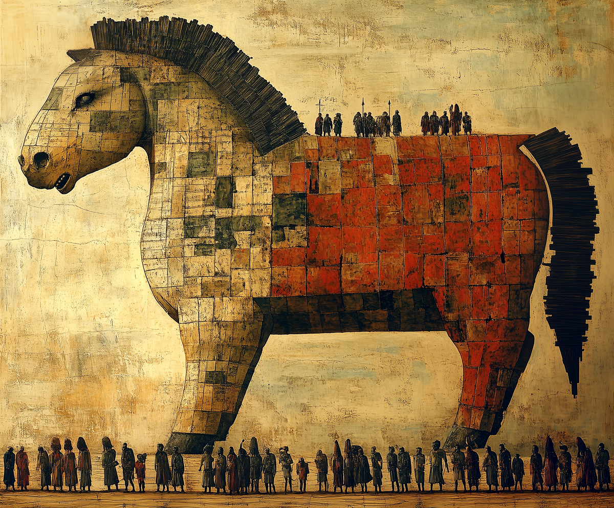 Когда греки «сдались» и «подарили» троянцам огромную лошадь, те и подумать не могли, что лошадь набита солдатами. Вроде бы приличный подарок от проигравших. Вот сидят они, празднуют победу, а греки в это время внутри лошади тихонько хихикают и разрабатывают план по захвату города. Троянцам был нанесён коварный удар. Зато теперь мы знаем, что не стоит принимать подарки от незнакомцев, особенно если они размером с дом.