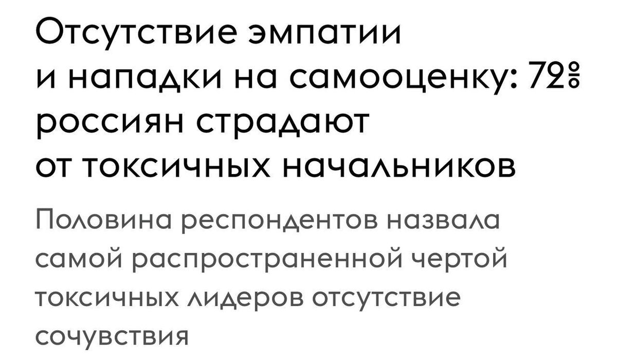 Отсутствие эмпатии и сочувствия — самые токсичные качества руководства. Было проведено целое исследование, результаты которого опубликовал Sostav Также в тройке токсичности руководства такие качества как «социальная изоляция отдельных сотрудников» и «привычка к манипуляции в ходе общения». В рейтинг также вошли: • политика двойных стандартов • негативные обобщения • запугивание • газлайтинг • давление на самооценку Проверяйте себя и своих руководителей на токсичность! Канал руководителя WEBSHOP про продажи и маркетинг: https://t.me/mArketing_and_me #маркетинг #руководители #коллеги #офис #работа