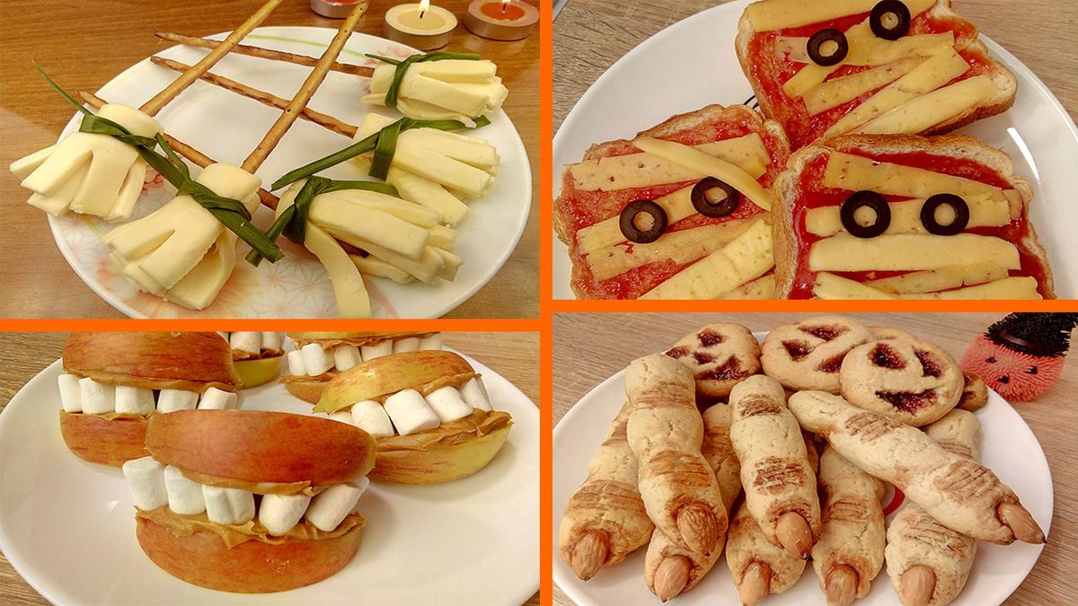 Готовлю праздничный стол с различными вкусняшками, закусками на Хэллоуин! HALLOWEEN - это для молодежи повод устроить тематическую вечеринку, детям покушать сладости, а хозяйкам опробовать новые рецепты. ************** ЗАКУСКА "МЕТЛА ВЕДЬМЫ" "ЧЕЛЮСТИ ИЗ ЯБЛОК" Нам понадобится: ПЕЧЕНЬЕ "ПАЛЬЦЫ ВЕДЬМЫ" Нам понадобится: "ТОСТЫ - МУМИИ" Нам понадобится: РЕЦЕПТ 1. Начнём с самого простого - берем плавленый сыр или обычный в нарезке. Складываем его пополам и делаем ножом надрезы, чтобы получилась бахрома. Далее берём соломку (желательно солёную) и заворачиваем её в кусочек сыра, завязываем перышком зелёного лука и всё - сырные метёлочки готовы. Так же можно их делать из ветчины. РЕЦЕПТ 2. Нарезаем яблоко на одинаковые куски примерно толщиной один сантиметр, вместо яблока можно использовать печенье. Смазываем каждый кусочек яблока с одной стороны арахисовой пастой или нутеллой, а в качестве зубов я беру маршмэллоу. Выкладываем в один или два ряда зубы, осталось соединить две половинки яблок с