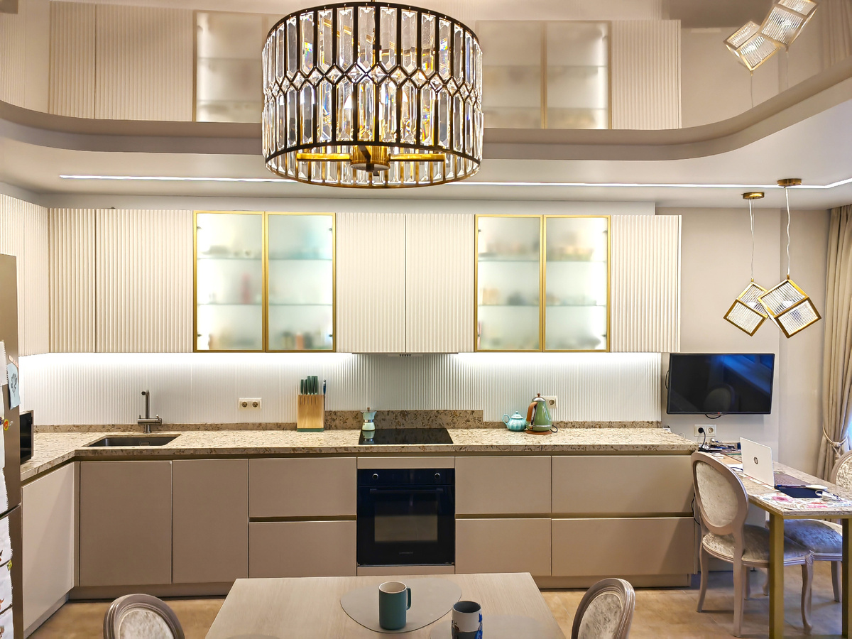 Большая светлая кухня с золотыми акцентами в ЖК "Светлый мир внутри". Верхний ряд шкафов с фасадами Флавио придает глубокий объем гарнитуру за счет элегантных плавных вертикальных линий, а фасады-витрины из стекла в алюминиевом профиле с интегрированной подсветкой добавляют легкости кухне. Выбранные цвета и материалы взаимодействуют, дополняют и подчеркивают друг друга, создавая ощущение гармонии. 📐Размеры кухни впечатляют: 2 030 х 4 960 см, готовить любимые блюда и встречать гостей на такой кухне максимально удобно и приятно. Фасады: Флавио в цвете RAL 9001 мат., Система в цвете NCS S 2005-Y40R мат. Витрины: Alum A1 в цвете Золото матовое Профиль LED накладной, рассеиватель: Glax Профили: Volpato в цвете Золото Фурнитура: Blum 🔥Цена проекта: 494 452 руб. Дизайнер - Юлия Горбачева. Салон «ЗОВ»: МЦ «Богатырь», пр. Богатырский, д. 18, корп. 2, , 1-й этаж, секция 119-15, 18 Понравился проект? Пишите сообщение в группу, чтобы получить бесплатный 3-D проект вашей кухни! МЫ СОЗДАЕМ МЕБЕЛЬ