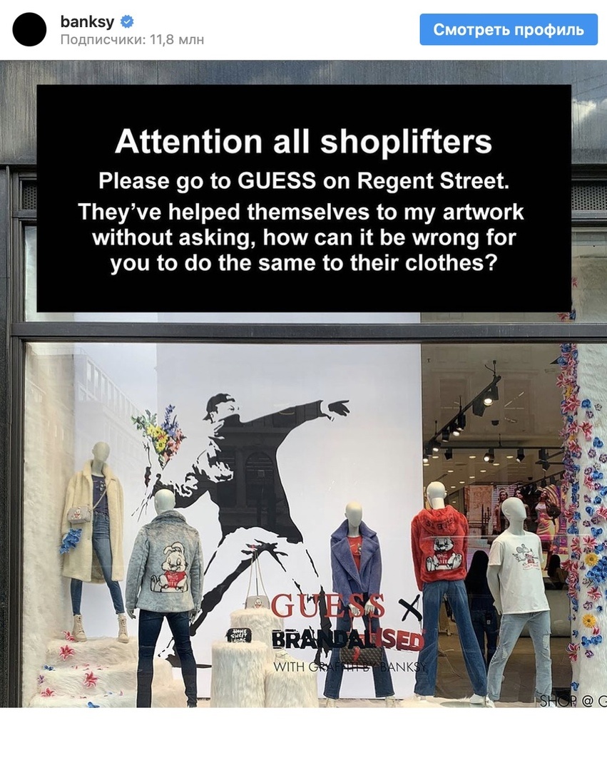 Совершенно неожиданно в одном из магазинов Guess в Лондоне появилась витрина, где бренд презентовал новую коллекцию, используя одну из самых известных работ Banksy с молодым человеком, бросающим букет. Интересно, что у Guess не было права на использование этой работы, поэтому Banksy решил отреагировать на ситуацию. Banksy попросил магазинных воров прийти в этот магазин Guess и начать воровать там вещи, чтобы бренд ощутил ровно те же чувства, которые ощутил Banksy, когда увидел свою работу на витрине. Так он поступил, потому что он не может подать в суд и его творчество сложно защищается авторским правом из-за того, что не раскрывается личность самого художника. Суду нужна эта информация, как и другим инстанциям, поэтому есть лишь один способ защиты творчества в данном случае – просьба о помощи. После этой публикации Guess сразу же закрыл этот магазин и спрятал витрину, чтобы разобраться с этим скандалом. Скорее всего они просто откажутся от использовании этой работы в оформлении прост