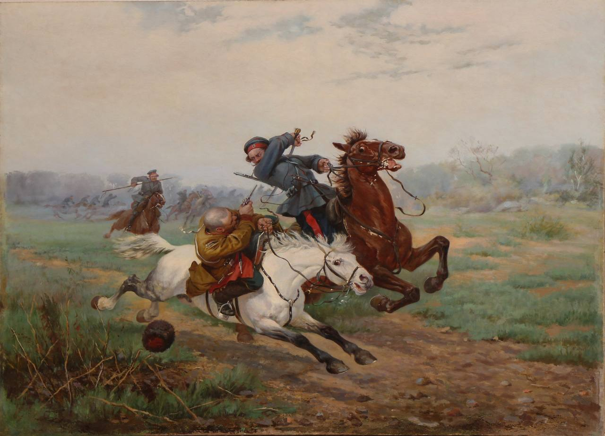 Именно так называлось первое полотно художника Виктора Мазуровского, который захотел запечатлеть самый решительный момент схватки. Картина посвящена эпизоду русско-турецкой войны 1877-1878 года. Картина была написана в 1891 году и журнал "Живописное обозрение" поместил на своих страницах вот такую рецензию. "Это полная энергии схватка русского казака с наездником-врагом взята целиком из нашей последней войны. Художник передал самый решительный момент: или тотчас пуля пронижет удалого казака, или вместе с выбитым из рук врага револьвером покатится на землю бритая голова, с которой уже слетела шапка...". Казалось, и сам художник не знал исход сражения и тема эта долго не отпускала его. Позже Мазуровский повторил сюжет своей картины в 1912 году, но вот вместо казака и турка он изобразил схватку польского улана и донского казака. Это произведение на холсте было посвящено событиям войны 1812 года и было написано к её столетию. Тут, кажется, исход более ясен и победа должна остаться за до