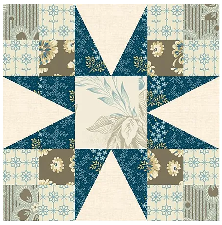 Инструкции по раскрою блока. 4 квадрата среднего тона 1 1/2" 8 светлых квадратов 1 1/2" 4 темных квадрата 1 1/2" 1 светлый квадрат 1 1/2" По 4 левых, шаблон А, и 4 правых, шаблон В, треугольника для звезды. 4 светлых треугольника С, вырезанных по шаблону С. Ссылка для скачивания шаблонов треугольников для звезды здесь here. Шьем блок с лучами звезды. Берем шаблоны А, В и С. Сшиваем треугольники В и С как показано. Разутюживаем. Добавляем к получившейся детали шаблон А. Разутюживаем. Размер детали с припусками должен быть 2 1/2". Шьем 4 детали. Далее шьем угловые блоки из квадратов. Берем 2 светлых, 1 среднего тона и 1 темный квадраты. Раскладываем по схеме. Сшиваем парами и разутюживаем. Полоски сшиваем вместе. Размер детали с припусками должен быть 2 1/2". Шьем 4 детали. Когда все детали блока готовы, добавляем центральный квадрат и раскладываем как показано на схеме. Сшиваем в ряды и разутюживаем. Ряды сшиваем между собой. Размер готового блока: 6" x 6" Разутюживаем