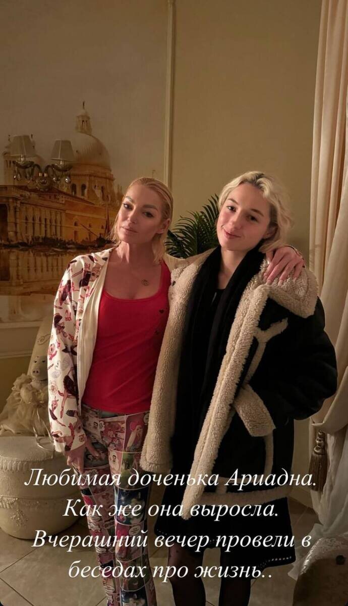 48-летняя Анастасия Волочкова не состоялась в личной жизни. Она часто говорит о многочисленных ухажерах и поклонниках, но под венец ее никто не приглашает. У балерины есть 19-летняя дочь Ариадна, которая изредка навещает ее. Сегодня в личном блоге она показала совместный снимок с единственной наследницей. Волочкова позировала в обнимку с Ариадной у себя дома. Поклонники отметили сходство во внешних чертах матери и дочери. «Каждая встреча с доченькой Ариандной всегда конструктивна и позитивна. Как же она выросла. Провели вечер в беседах о жизни», — подписала снимок Анастасия. Кадр из блога Анастасии Волочковой Отметим, что у балерины с дочкой близкие отношения. Этим летом она давала интервью о жизни Ариадны в семье отца. У Вдовина и Елены Николаевой двое детей, младший родился этой весной. Волочкова считает, что ее дочери может не хватать внимания, поэтому за советом и теплом она приезжает к маме.