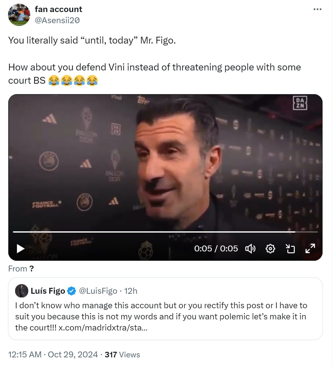 Кажется, Луиш Фигу – главный 🤡 церемонии «Золотого мяча»: угрожал фанатам «Реала» судом, но быстро получил ответку