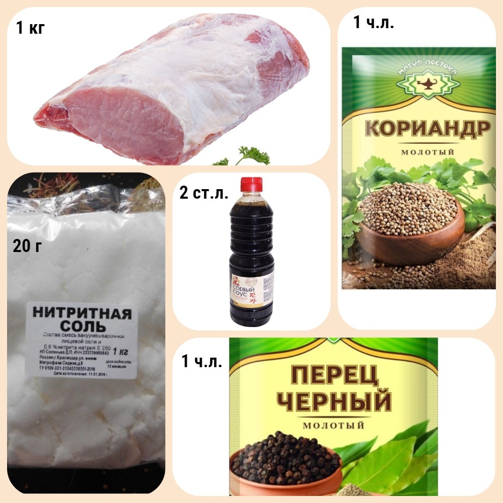 Даю пропорции на килограмм свинины. Я обычно беру или окорок, или карбонад. Также можно завялить индюшатину или курицу. Здесь базовый набор специй, который вы можете дополнить, например, курицу мы «украшаем» имбирем молотым, а индюшатину — паприкой.