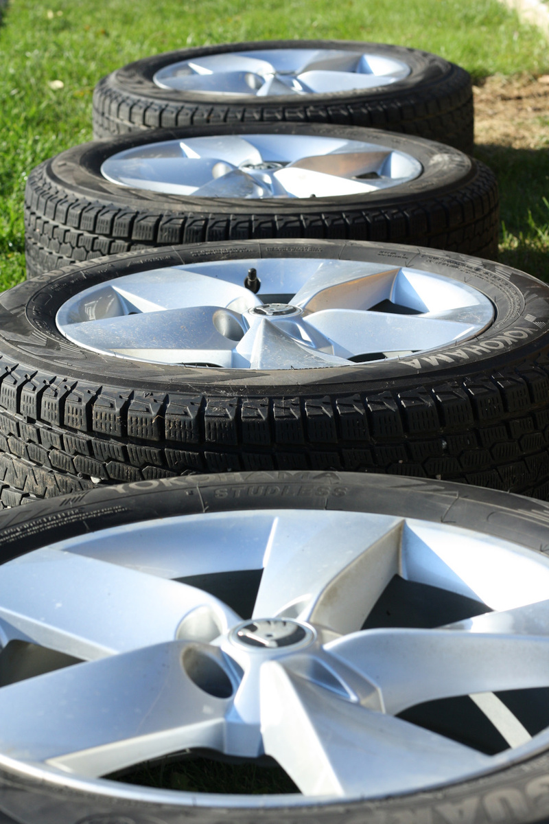 На зимнюю резину, в частности, я периодически наношу защитные составы российских брендов, которые реально работают и позиционируются как профессиональные. Достойный вид обеспечивают и неплохо защищают поверхность резины от впитывания всей грязи с дороги. Это можно увидеть вот на этой фотографии. Только достал из пакетов комплект зимних колёс для большого марафета. Видно что сама резина слегка пыльная и на подготовку к нанесению защитного состава много времени не уйдёт. Вся грязь поверхностная.