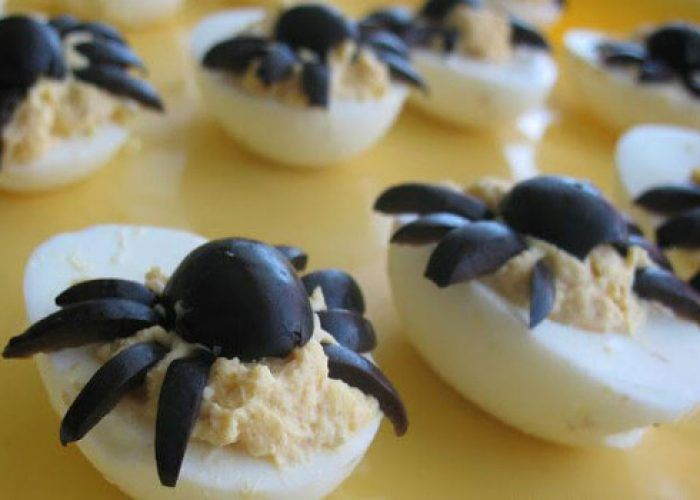Каждую ягоду маслины режем пополам. Одну половинку выкладываем на каждое яйцо – это «тело» паука, вторую разрезаем на полосочки, которые раскладываем вокруг «тела», имитируя лапы.