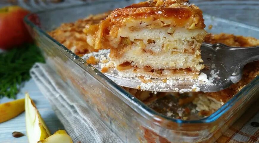 Готовить насыпной яблочный пирог - легко и быстро. Без теста и лишней грязной посуды! Нужно всего лишь натереть яблоки и переслоить их смесью муки, сахара и корицы. Полить сливками, отправить в духовку, и уже совсем скоро ваш дом наполнится волшебным ароматом яблок и корицы. Менее чем за час у вас на столе будет готовый пирог! Очистите яблоки от семян и нарежьте кубиками или натрите крупной теркой. Добавьте к ним сахар и корицу, перемешайте. Растопите сливочное масло в сотейнике на среднем огне до легкого коричневого оттенка, чтобы появился ореховый аромат. Следите, чтобы масло не подгорело. Снимите масло с огня, оставьте осадок на дне. Добавьте масло к яблокам, хорошо перемешайте и дайте настояться 3-4 минуты. Смешайте манку, муку, сахар, соль и разрыхлитель в миске. Это будет основа для слоев пирога. Смажьте форму маслом. Насыпьте 3-4 ст. л. сухой смеси, затем слой яблок. Повторите 3-4 слоя. Залейте пирог сливками, посыпьте оставшейся сухой смесью и выпекайте при 170°C 45-50 минут.