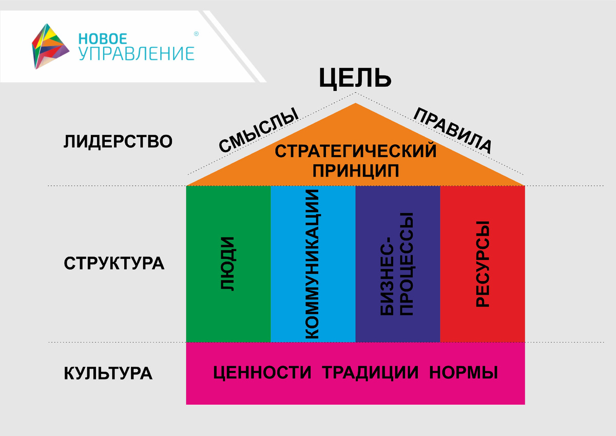 Мы представляем любую организацию как здание – с фундаментом (ценности, традиции, нормы), стенами (люди, коммуникации, бизнес-процессы, ресурсы), мансардой (стратегический принцип), двускатной крышей (смыслы и правила) и вершиной (целями). Так метафора ДОМ превратилась в рабочую модель, которая увязала взаимные обязательства между участниками системы, баланс «даём-берём», сложившиеся отношения людей и их доверие друг к другу. ДОМ существует в МИРе. Чтобы ДОМ крепко стоял «на ногах» и многие годы был полон жизни, ему необходимо быть гибким для принятия изменений, иначе баланс с вечно изменчивой внешней средой окажется недостижимым.