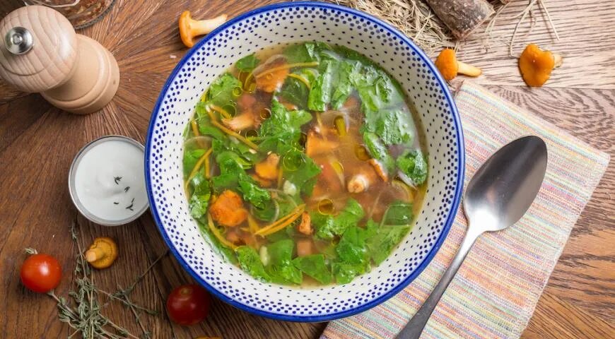 Замочите лисички в холодной воде на 15-20 минут. Нарежьте картофель кубиками, залейте 500 мл воды и поставьте вариться. Морковь и лук нарежьте тонкой соломкой, добавьте лисички и обжарьте на оливковом масле до готовности. Смешайте овощи с картофелем и варите еще 5 минут. Приправьте солью и перцем по вкусу. За минуту до окончания варки добавьте рваный шпинат и нарезанные кубиками помидоры. Полейте оливковым маслом и подавайте со сметаной. Если Вам понравился рецепт, ставьте лайки, подписывайтесь на нас.