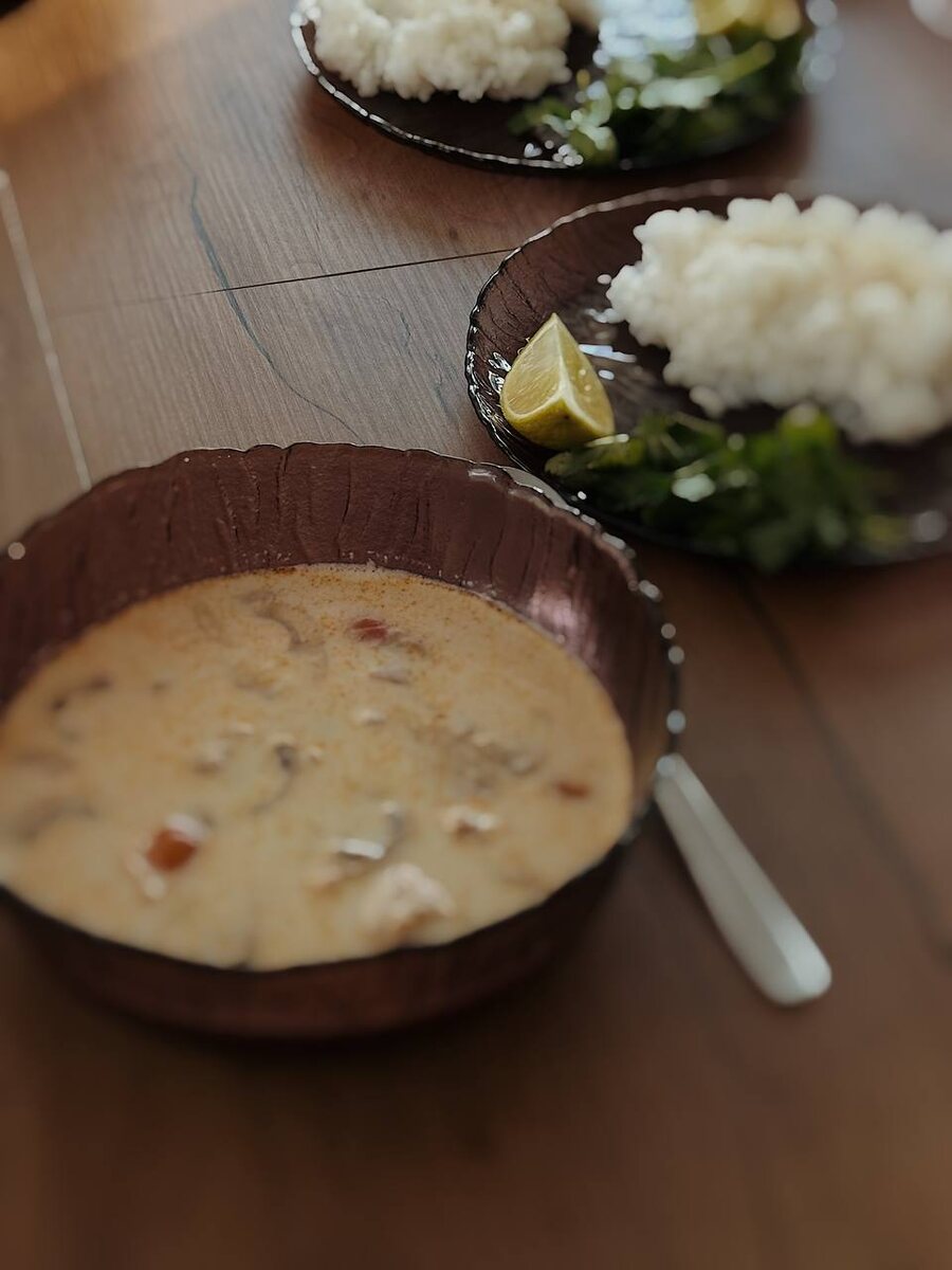 Маленькое предисловие: на звание ориджинал том ям это блюдо не претендует, но если вы хотите чутка прикоснуться к тайской кухне, при этом не собирая со всего света все ингредиенты - вариант супер. В банке с суповой основой содержится: Вода, индийские вешенки, паста карри Том Ям, лемонграсс, галангал, перец чили красный, кориандр, соль, каффирные листья, сахар, регулятор кислотности лимонная кислота, ароматизатор «Лимон». Ингредиенты: 🟤Куриное филе - 1-1,5 шт 🟤Суповая основа для Том Яма Aroy-D - 2 банки 🟤Помидоры черри - 1 упаковка 🟤Шампиньоны - 250 гр 🟤Креветки - 450 г (тут смотрите сами) 🟤Кокосовое молоко - 500 мл (можно больше, если хотите сбавить остроту) 🟤Рис круглозерный - по желанию 🟤Лайм 🟤Кинза 🟤Кунжут 🟤Соль по вкусу *еще можно добавить пасту Том ям, если хотите острее Приготовление: 🟠Ставим вариться курицу и начинаем подготавливать полуфабрикаты: чистим креветки от панциря и каках, режем помидоры и грибы; 🟠В готовый куриный бульон выливаем 2 банки суповой основы, д